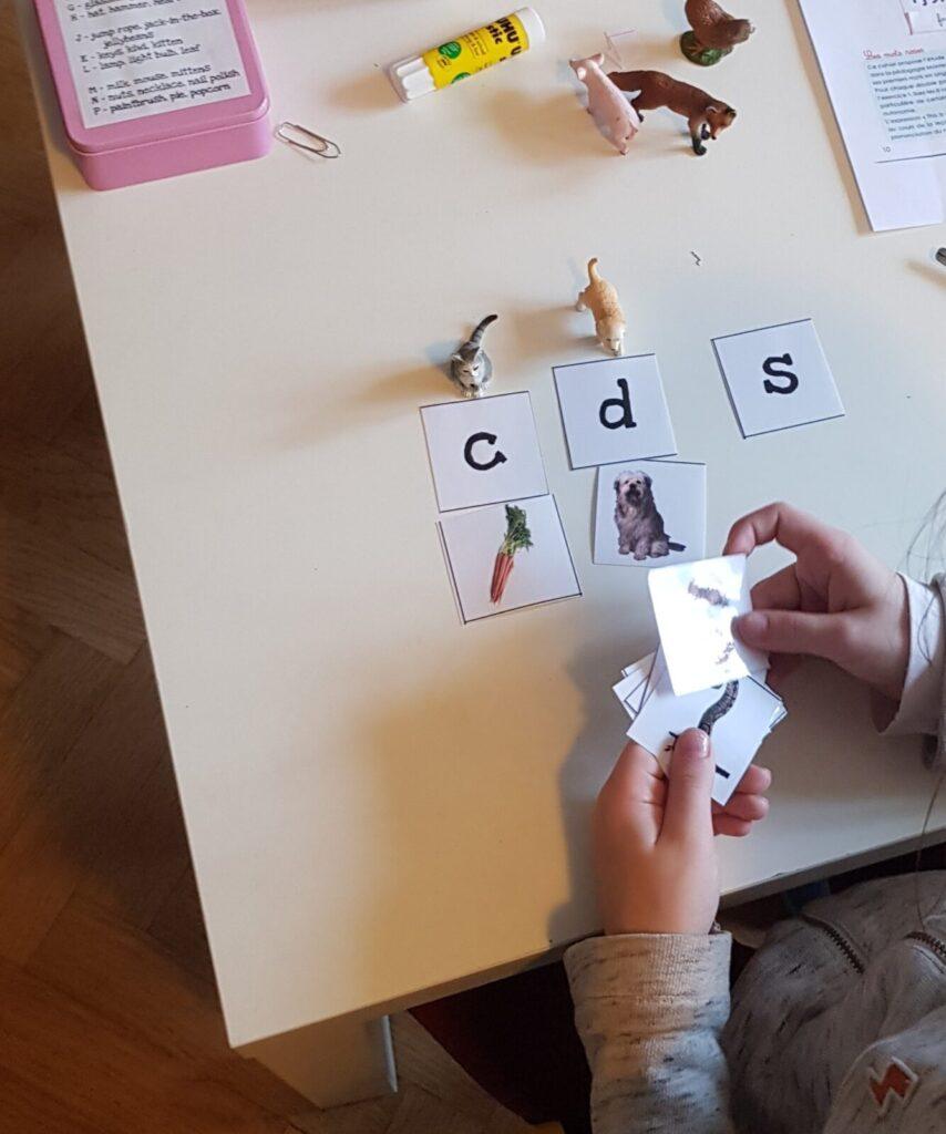 Pour l’apprentissage de la lecture, en fonction des enfants, j’utilise également la méthode des Alphas fondée sur les principes phoniques, de plus en plus utilisée en classe et qui complète très bien la méthode Montessori.